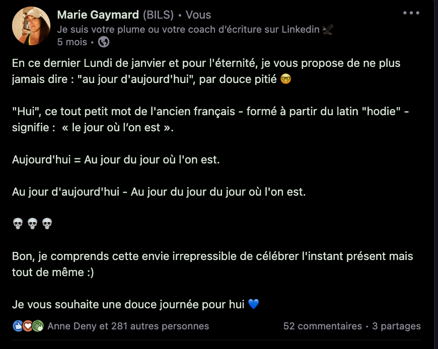 En ce dernier Lundi de janvier et pour l’éternité, je vous propose de ne plus jamais dire : « au jour d’aujourd’hui », par douce pitié