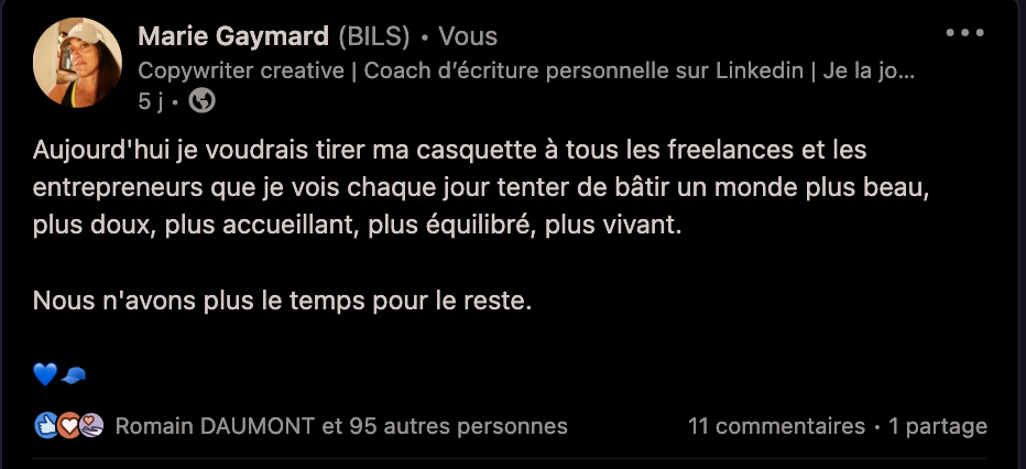 Aujourd’hui je voudrais tirer ma casquette à tous les freelances et les entrepreneurs que je vois chaque jour tenter de bâtir un monde plus beau, plus doux, plus accueillant, plus équilibré, plus vivant.